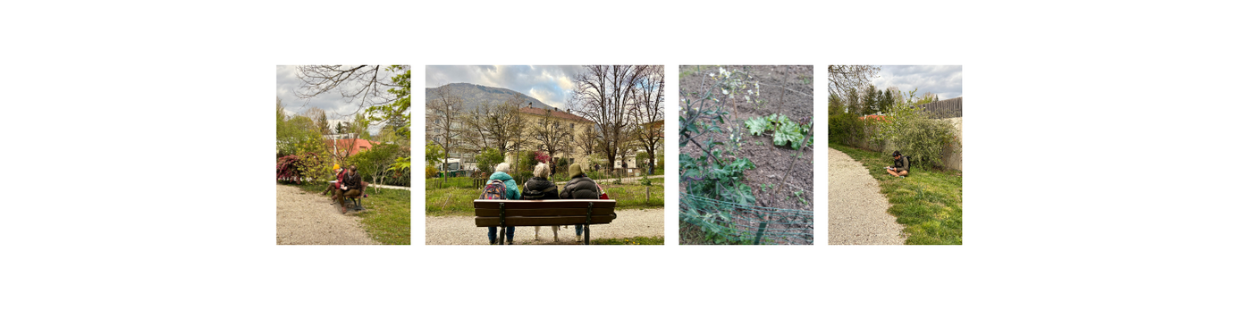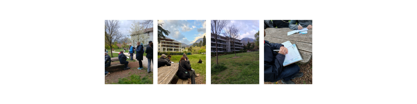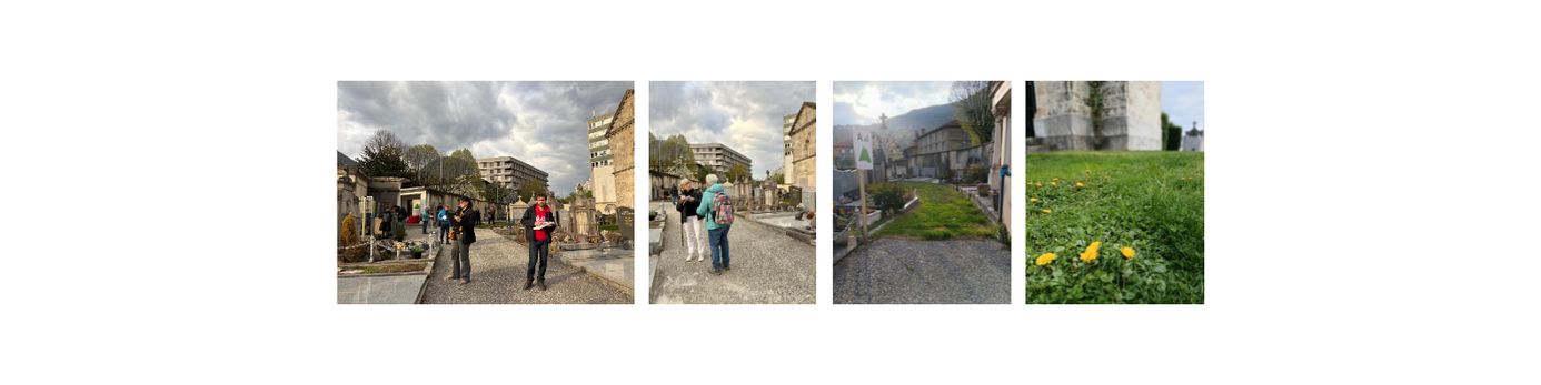 Deuxième arrêt, le cimetière de la Tronche. Vue dégagée sur la Bastille, les montagnes, l'hôpital tout proche. Un composteur, des allées en gravier. Le paradoxe saute aux yeux : hôpital/vie, cimetière/mort, compost/matière qui se refait. Quelqu'un a ri. Et c'était la bonne réaction, parce que c'est là que le lieu a commencé à parler. Pas de bancs, peu de mobilier : un espace de repos qui donne envie de s'y asseoir.